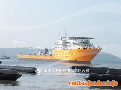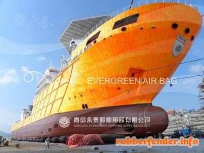 命名为 “CABALLO MAYA”的该潜水支持船,建造在大坡度的简易平台上。平台由6米间距的水泥桩,以及填充在水泥桩之间的碎石构成,平台末端离海面的距离超过80米。因此该船的气囊下水具有较大的难度。