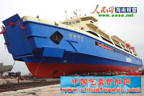 船用气囊成功下水,“信海19号”总长119.18米,船高包括桅杆为19.8米,型宽19.8米,型深6.3米,设计吃水4米,航速15.3节,载货装车量为41标准车,可同时搭载999客(人),系目前琼州海峡最大、最豪华的客滚船,按照五星级标准进行内部设计装修,其中室内室外建有咖啡厅,面积达720平米,可同时供300名客人休闲娱乐,房间内安装有电视、电话、摄像探头,船上配备有小型超市,配备了目前国内国际最为先进的设备设施,诸如海上安全撤离系统和通讯导航系统,可以引领船只在恶劣天气条件下安全航行;抗风等级可抵抗9级台风。