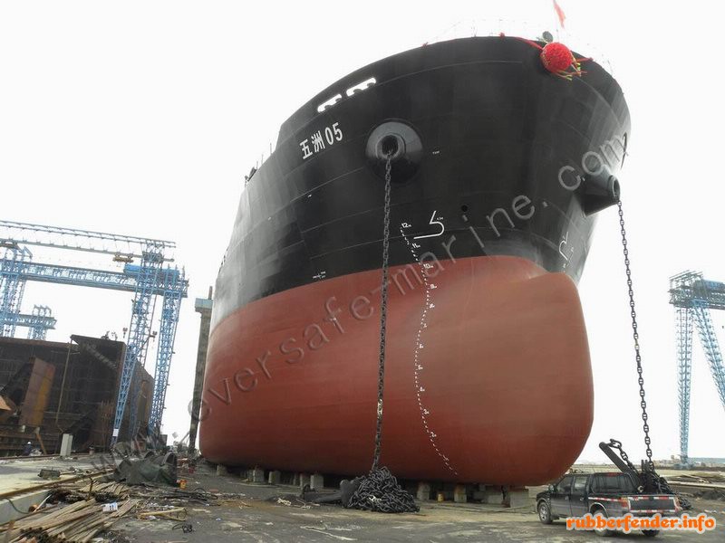 该下水工程中所使用的高强度船用气囊再一次展现了过硬的质量。顶升船体时,船用气囊的最小压力达到0.16 Mpa,最高压力达到0.2 Mpa,并持续超过10个小时。正是因为对该产品质量的百分之百信心,才会采用48只船用气囊下水9000吨自重的巨轮。