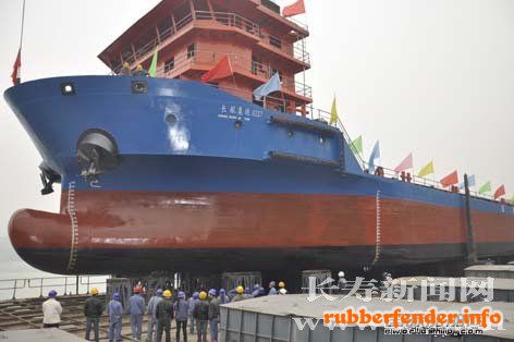 。今年,该厂主动出击拓展市场,揽下8艘325集装箱自航船订单,目前完成交付7艘。图为正在准备下水的325标箱集装箱船